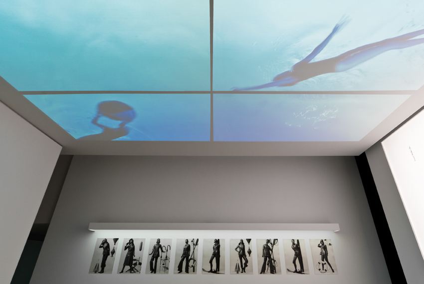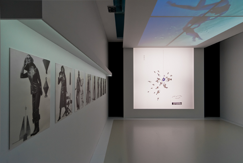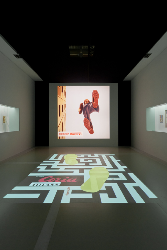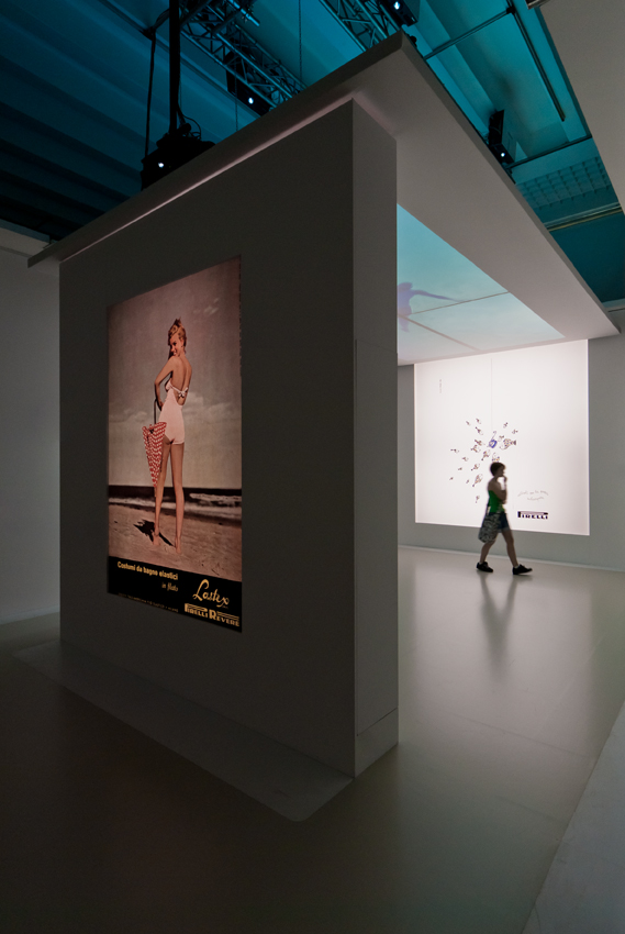 Nell’ambiente successivo la proiezione a pavimento di una pubblicità di Munari si riempie di parole cadute dalla parete. Più avanti la pioggia bagna le bellissime immagini delle campagne pubblicitarie di Mulas. Nella terza sala ci ritroviamo immersi sotto la superficie dell’acqua: bagnanti d’altri tempi si tuffano sopra di noi in mezzo alle immagini originali di una giovane Marilyn Monroe e di coloratissimi bozzetti.