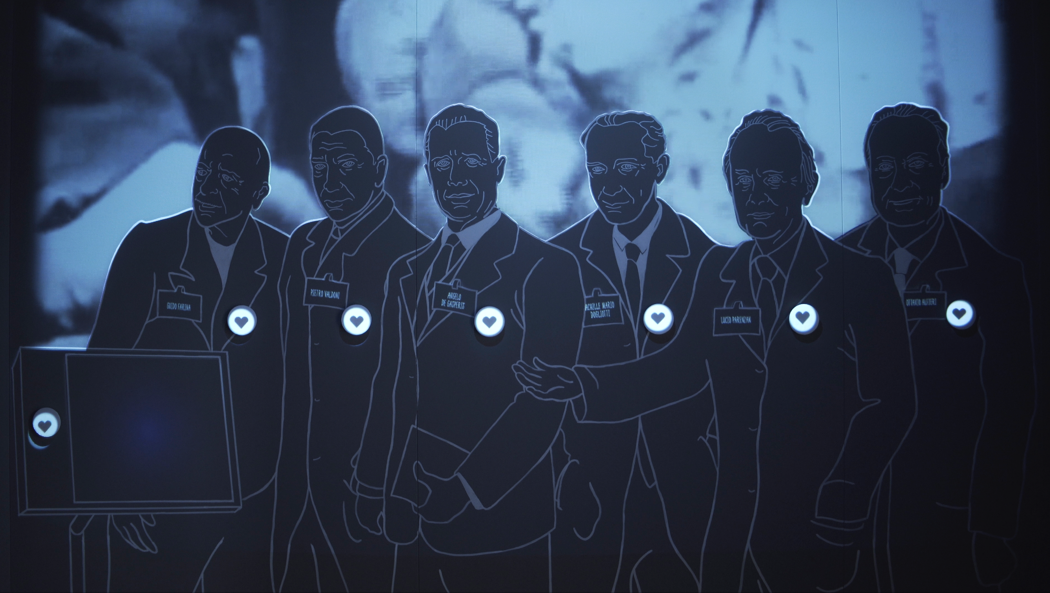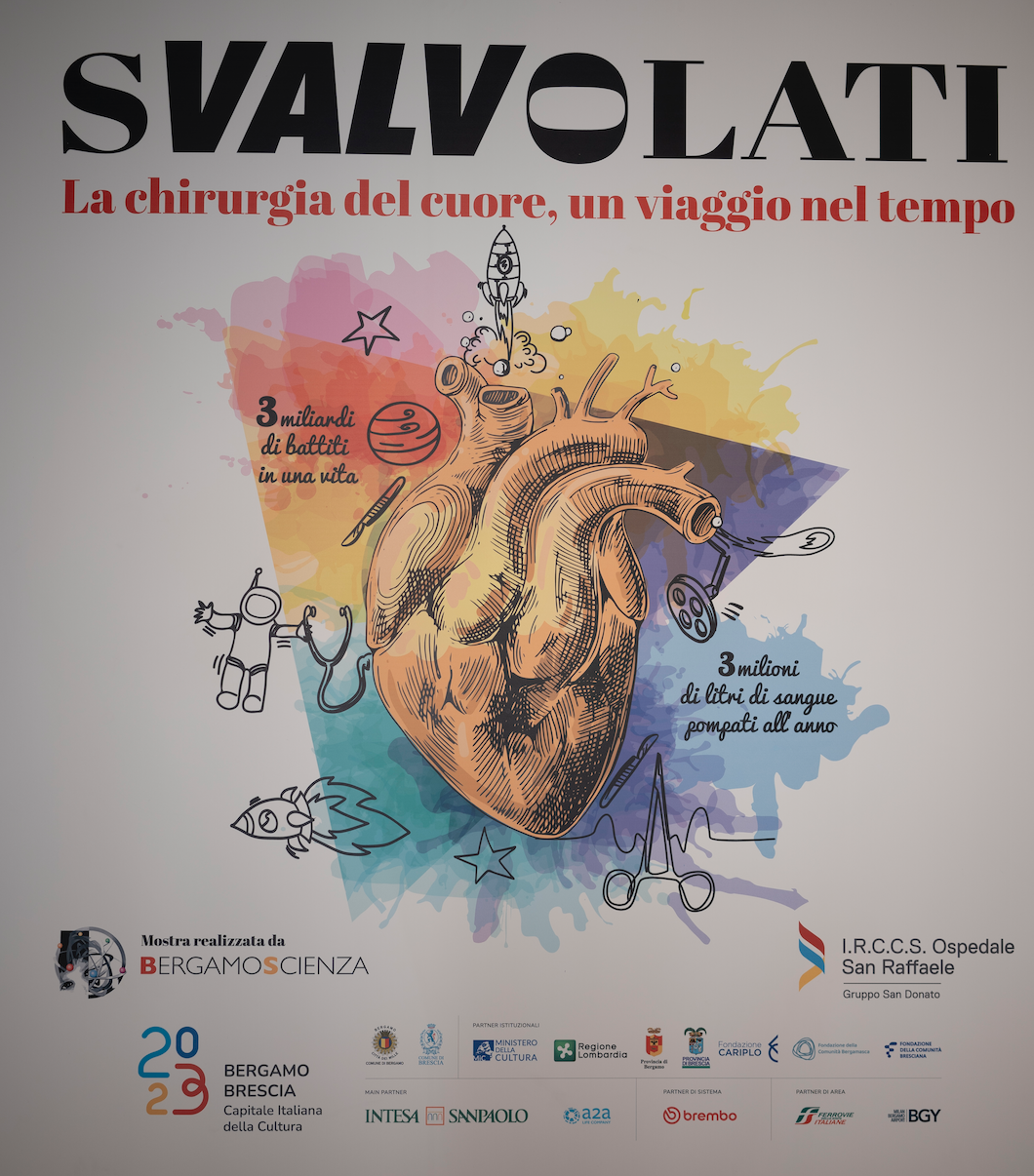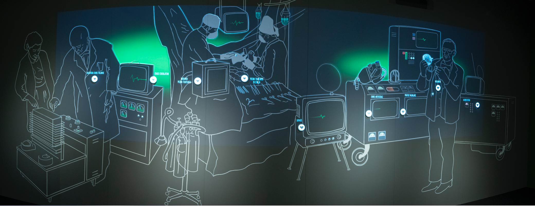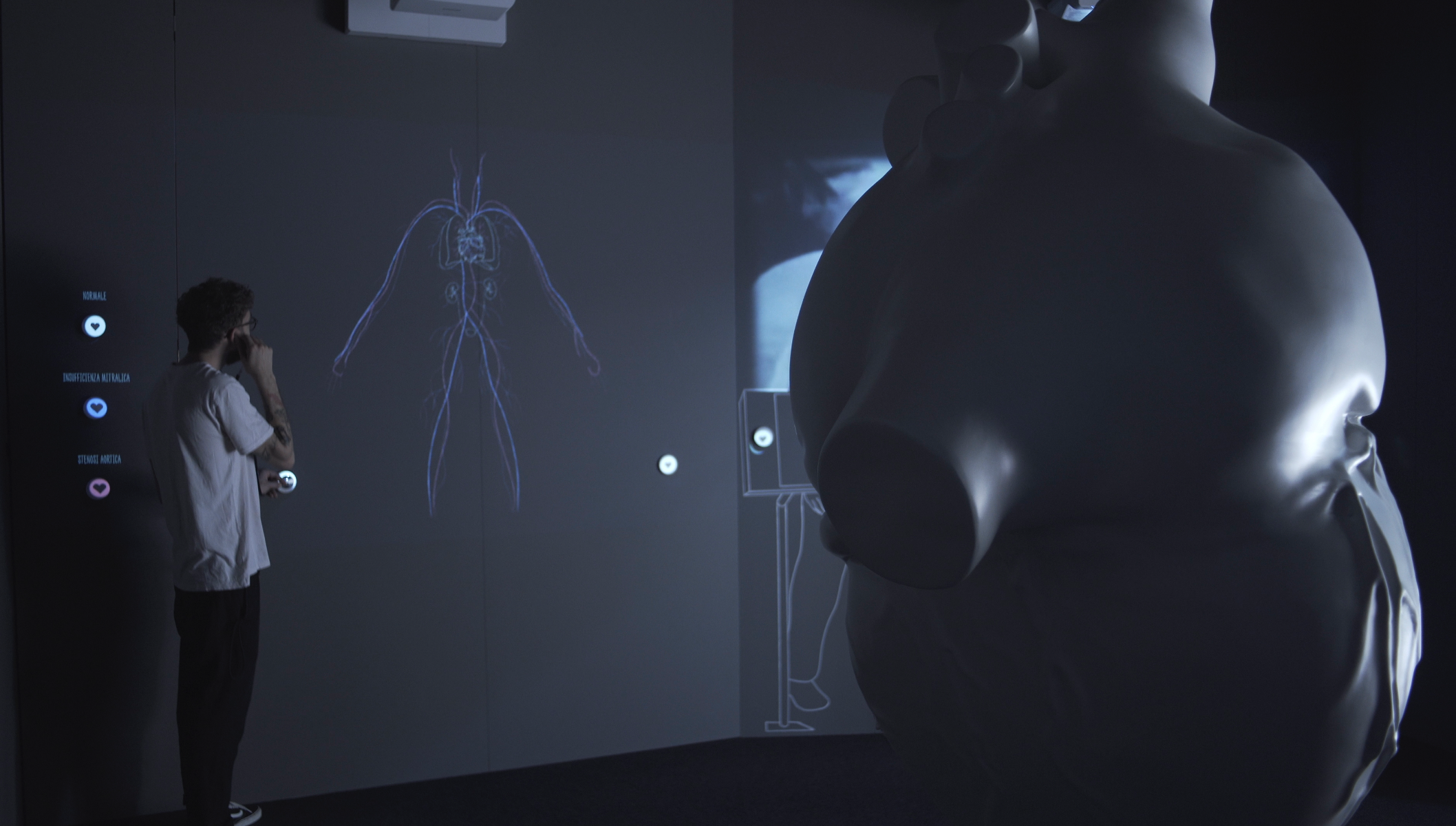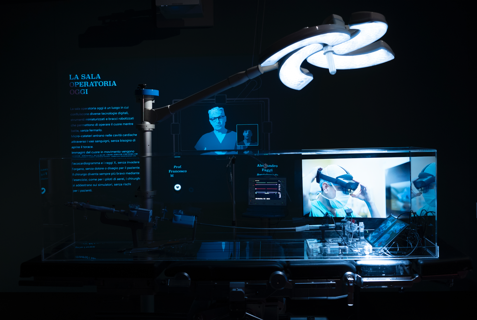 La prima tappa del viaggio è un’installazione interattiva che racconta come è fatto e come funziona il cuore. È possibile ascoltare il battito regolare e anche i sintomi che rimandano ad alcune patologie. Alle pareti,due grandi videoproiezioni interattive permettono di esplorare: la storia del cuore e del suo ruolo nella cultura medica, a partire dagli egizi per arrivare all’Ottocento. Gli approfondimenti audiovisivi dei singoli POI (Point Of Interest) vengono attivati dai visitatori mediante un “device di interazione” estremamente iconico e simbolico: il fonendoscopio che viene fornito all’ingresso a ciascun visitatore e che, appoggiato ai punti segnalati sulle pareti, permette di ascoltare le narrazioni che riguardano singoli temi. La seconda tappa accompagna il visitatore indietro nel tempo, in una sala operatoria del 1860 che era il tavolone di una cucina di contadini, da cui deriva appunto il nome di “tavolo operatorio”. La terza sala ci porta a metà del XX secolo, negli anni ’60-’70 e a seguire si entra nella sala operatoria del presente e del futuro.